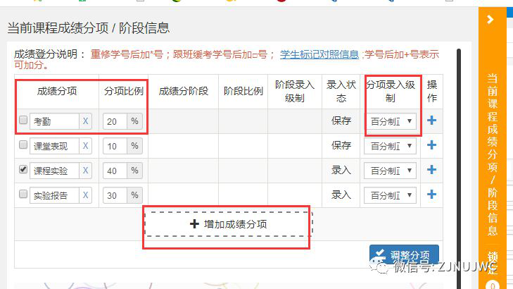 输入完成后勾选其中一项(须是期末成绩项),再点调整分项保存。