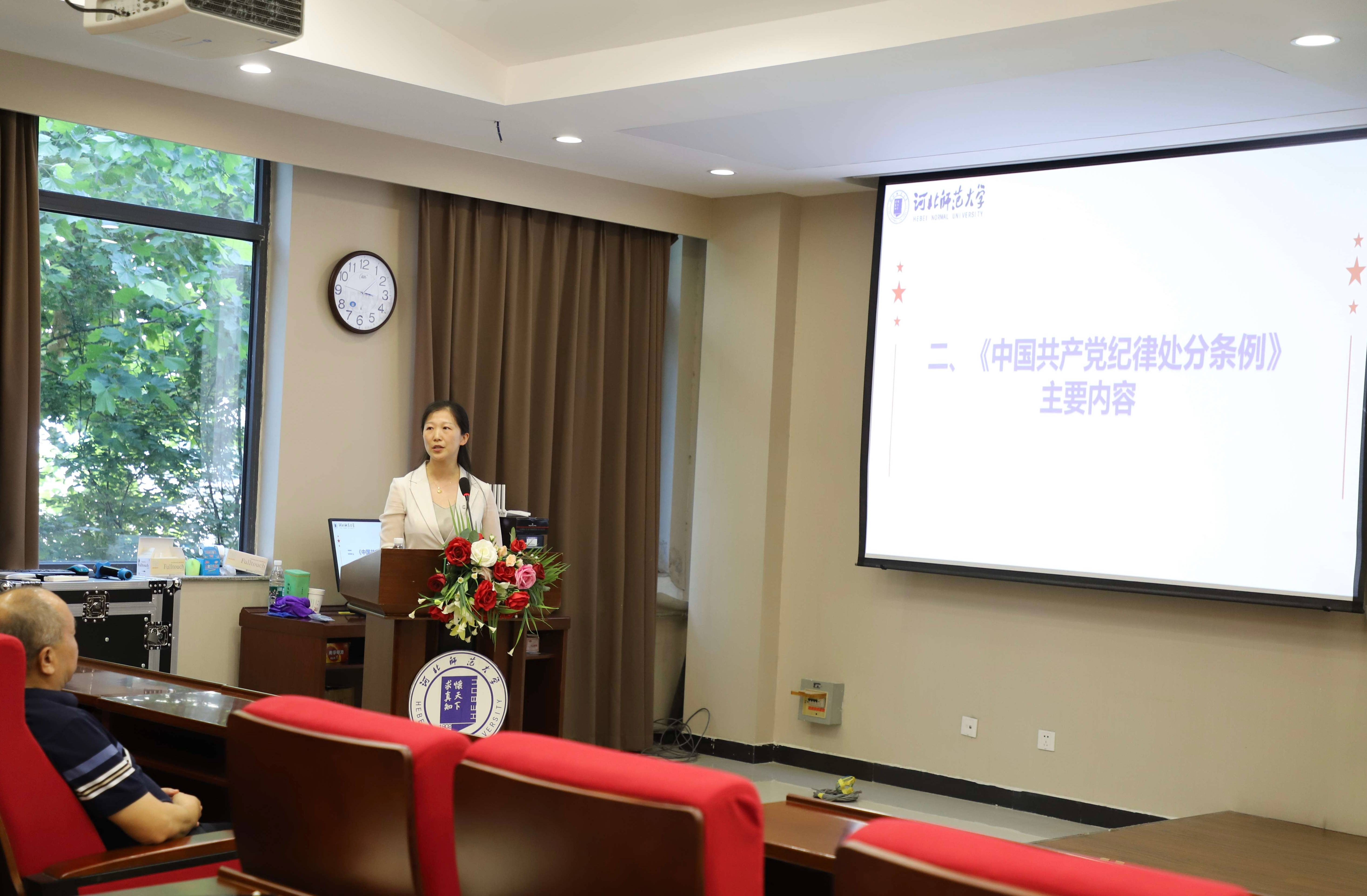 张丽楠从开展党纪学习教育的背景与要求、《中国共产党纪律处分条例》主要内容、《条例》新增或修改的重点条文解读三部分展开讲解。她阐释了在全党开展党纪学习教育的重大意义和具体要求,讲解了《中国共产党纪律处分条例》的基本框架和主要内容,对“六大纪律”中新增或修改的重点条文进行了详细解读。播放的反腐倡廉专题片《清廉中国》,案例精密结合高校教师工作实际,具有很强的针对性和警示教育意义。党员老师们认识到,遵纪违纪就在一念之间,只有原原本本、融会贯通、联系实际学好《中国共产党纪律处分条例》,才能自觉将纪律要求内化于心、外化于行,真正做到忠诚、干净、担当。